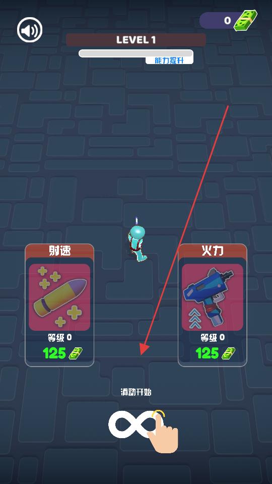 1、進(jìn)入游戲界面看到下方的滑動(dòng)開始提示,滑動(dòng)對應(yīng)的無限符號區(qū)域,即可開啟第一關(guān)的射擊生存挑戰(zhàn),此時(shí)角色會(huì)進(jìn)入布滿紅色小人的場景。