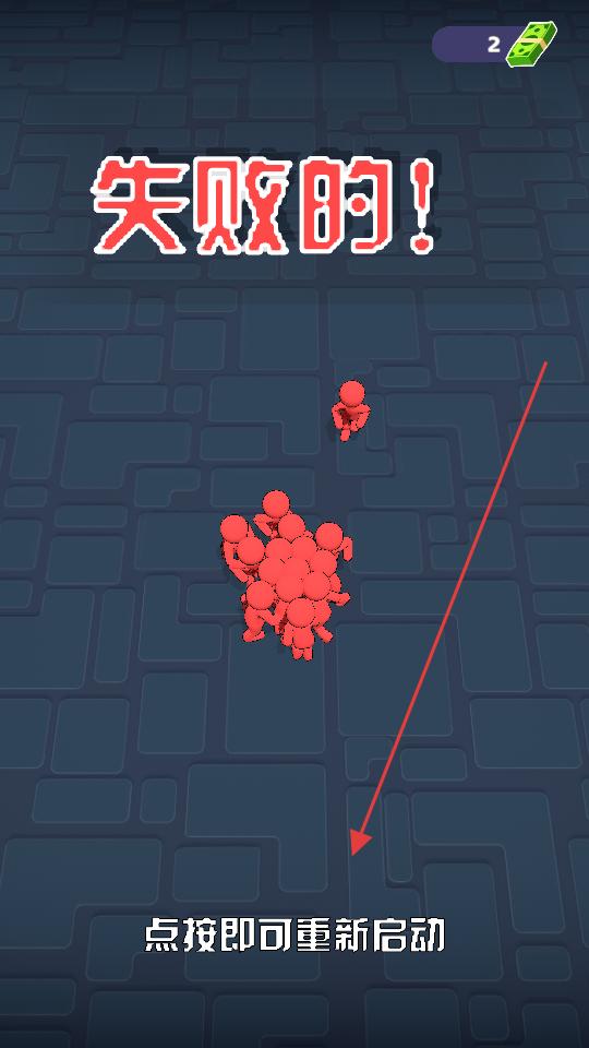 4、如果角色被紅色小人包圍導(dǎo)致挑戰(zhàn)失敗,屏幕會(huì)顯示失敗的提示,此時(shí)點(diǎn)擊屏幕,即可重新啟動(dòng)游戲,再次進(jìn)入關(guān)卡嘗試。