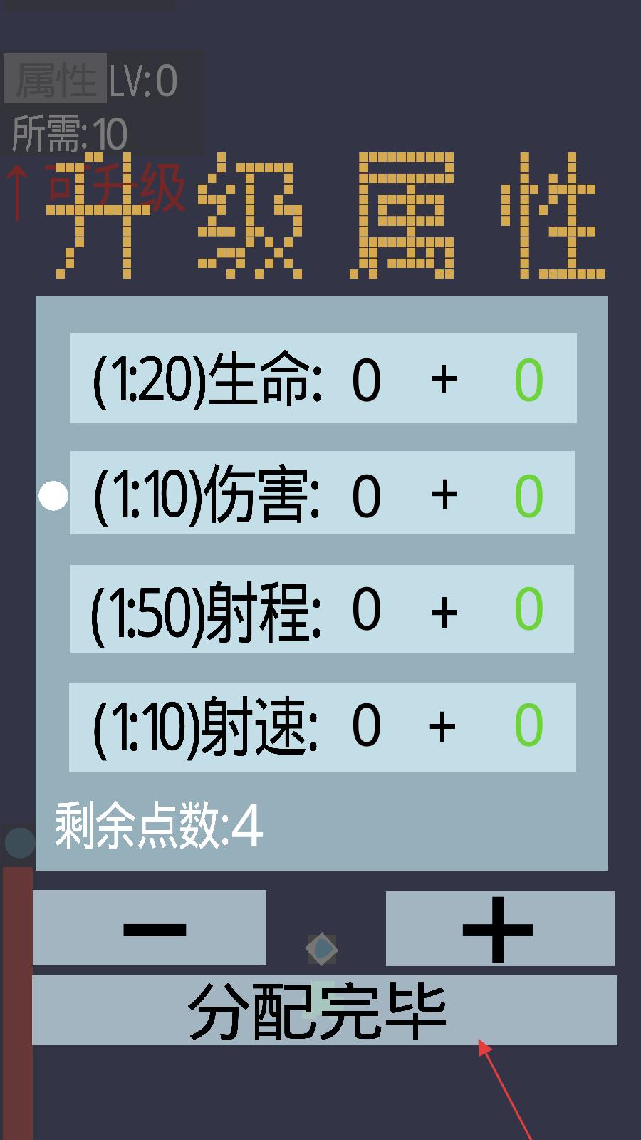 2、進入游戲后,會出現(xiàn)升級屬性界面,界面上有生命、傷害、射程、射速等可升級屬性,根據(jù)需求分配點數(shù)后,點擊分配完畢按鈕,完成屬性分配。