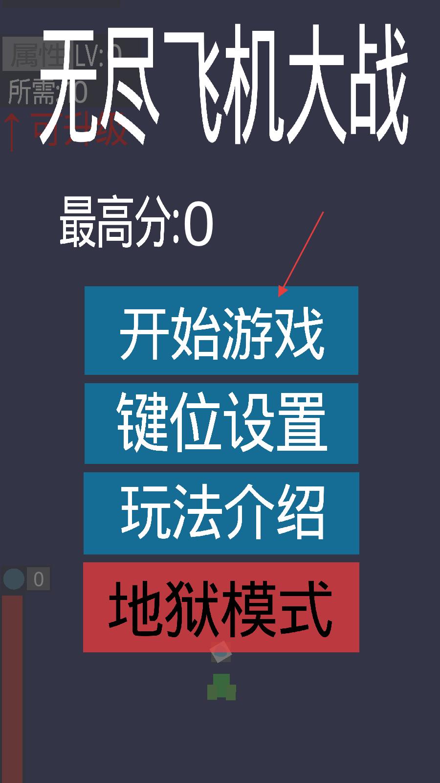1、打開無盡飛機大戰(zhàn)游戲,在主界面看到開始游戲、鍵位設置、玩法介紹、地獄模式等選項,點擊開始游戲選項,即可進入游戲關(guān)卡。