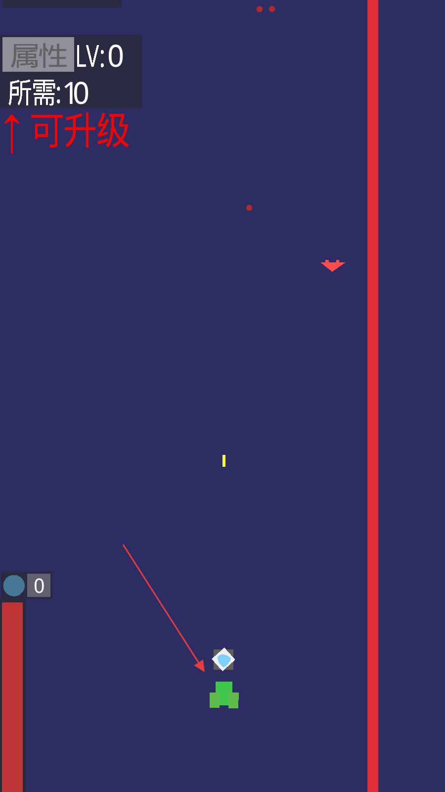 3、完成屬性分配后,進入游戲戰(zhàn)斗場景,操控綠色飛機在深藍色背景的戰(zhàn)場中移動,躲避紅色敵機發(fā)射的子彈,同時發(fā)射子彈攻擊敵機。