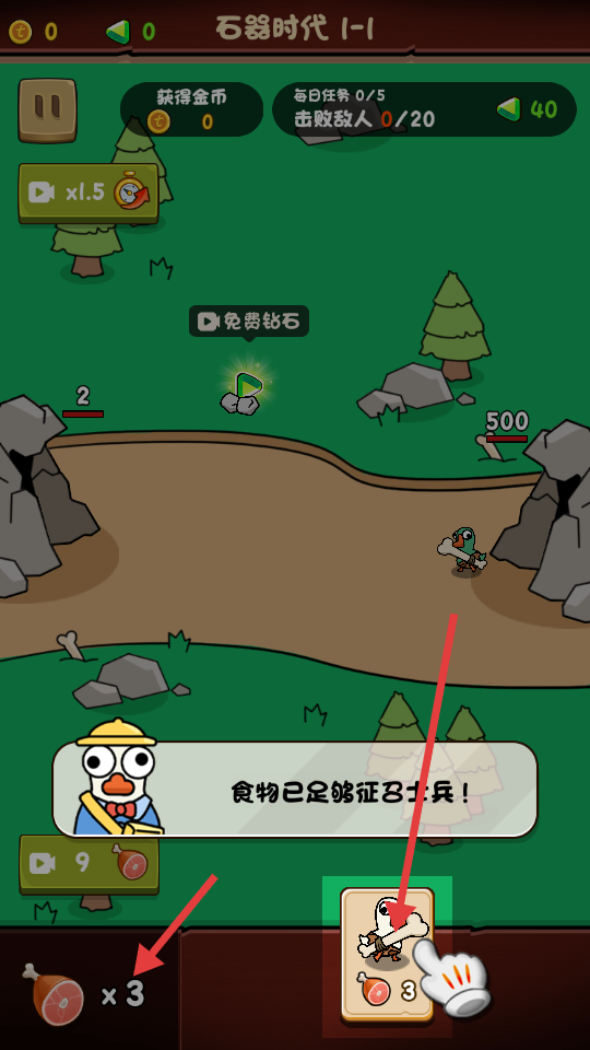 2、戰(zhàn)斗時(shí)當(dāng)提示食物已足夠征召士兵,點(diǎn)擊下方士兵卡片,消耗食物征召士兵,玩家要壯大隊(duì)伍助力戰(zhàn)斗。