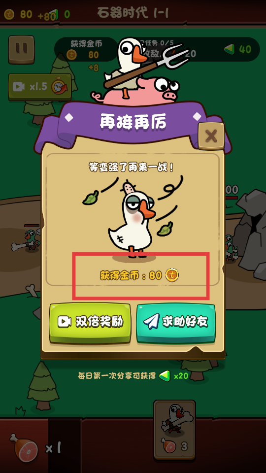 4、若戰(zhàn)斗失敗也會(huì)獲得金幣獎(jiǎng)勵(lì),可選擇雙倍獎(jiǎng)勵(lì)看廣告獲取更多金幣,或求助好友之后提升實(shí)力再挑戰(zhàn)關(guān)卡。
