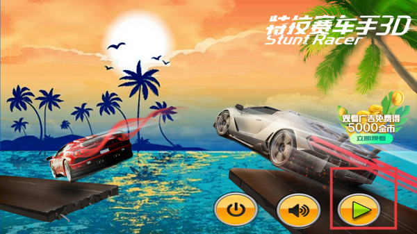 1、玩家下載游戲之后在游戲主界面,點(diǎn)擊右下角的綠色播放按鈕,即可進(jìn)入游戲關(guān)卡,開(kāi)啟特技賽車(chē)挑戰(zhàn)。
