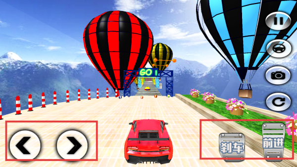 3、在游戲過(guò)程中通過(guò)屏幕左下角的左右方向按鈕控制賽車(chē)轉(zhuǎn)向,利用屏幕右下角的前進(jìn)和剎車(chē)按鈕來(lái)控制賽車(chē)的行駛與制動(dòng)。