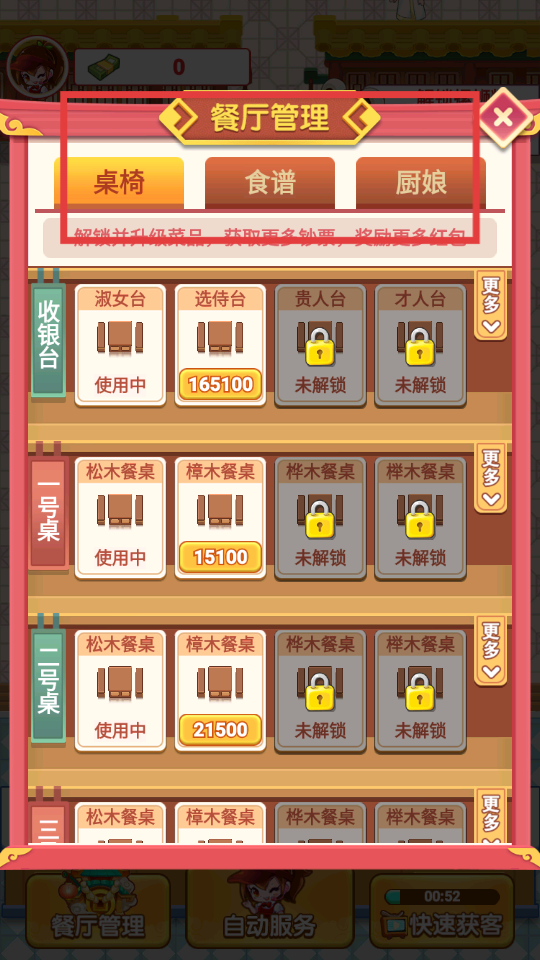 3、點擊餐廳管理進(jìn)入管理界面,可看到桌椅、食譜、廚娘等分類,在桌椅分類下能用金幣解鎖更高級的桌椅,可以優(yōu)化餐廳設(shè)施吸引更多顧客前來。