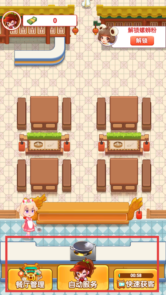 2、進(jìn)入餐廳場景后,下方有餐廳管理、自動服務(wù)、快速獲客等功能按鈕,可根據(jù)需求點擊管理餐廳運營,提升服務(wù)效率和客流量,增加自己店鋪的收益。