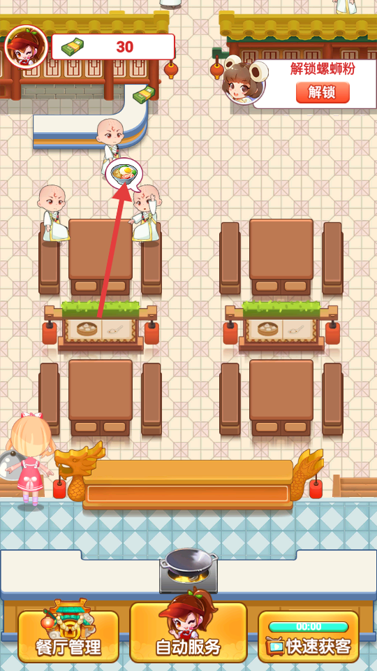 4、餐廳有客人到來后,注意客人頭上的餐品提示,及時將對應(yīng)的餐品送到客人桌前,滿足客人需求獲取金幣等獎勵,可以促進(jìn)餐廳發(fā)展。