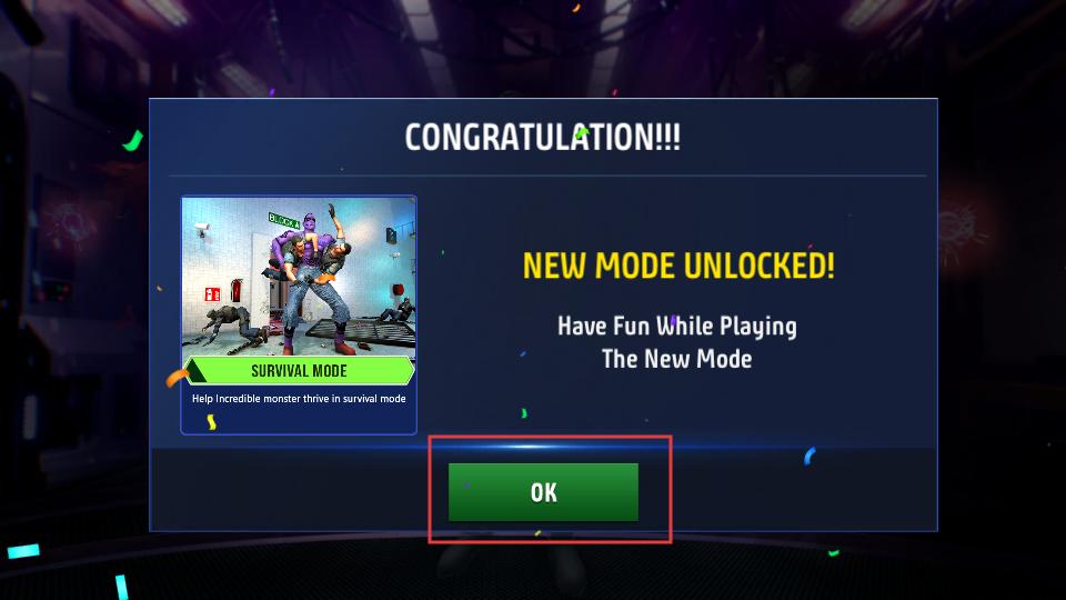 4、成功達(dá)成一定條件后,會(huì)解鎖新游戲模式,出現(xiàn)提示界面,點(diǎn)擊OK按鈕,即可體驗(yàn)新的游戲內(nèi)容,繼續(xù)冒險(xiǎn)。