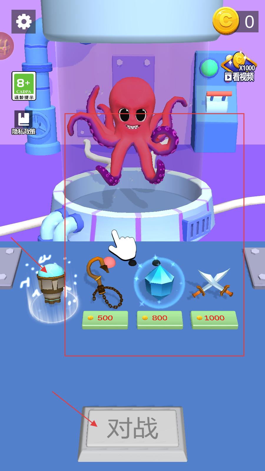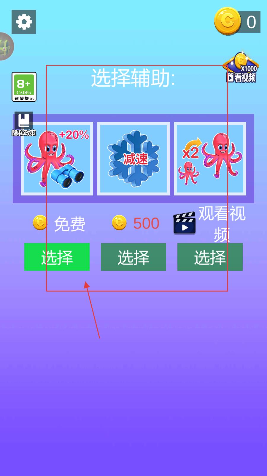 2、對(duì)戰(zhàn)前能選輔助,有免費(fèi)的章魚望遠(yuǎn)鏡、500金幣的減速效果等,玩家可根據(jù)需求選擇。