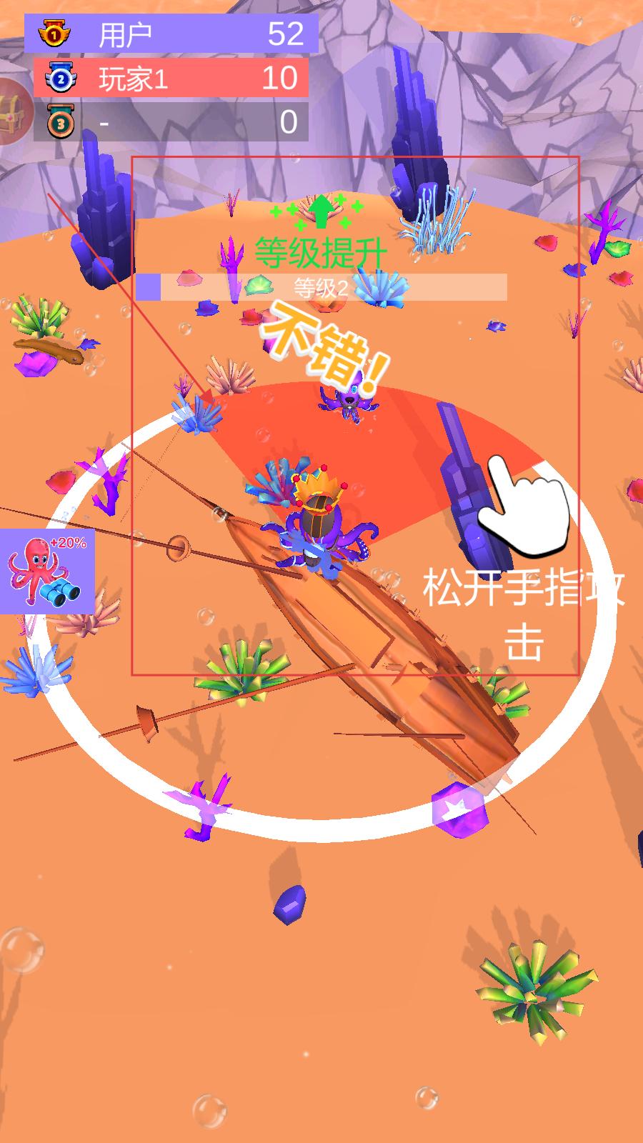 3、在對(duì)戰(zhàn)時(shí)需要操控章魚角色,在合適時(shí)機(jī)松開(kāi)手指發(fā)動(dòng)攻擊,擊敗對(duì)手可提升等級(jí),積累優(yōu)勢(shì)。