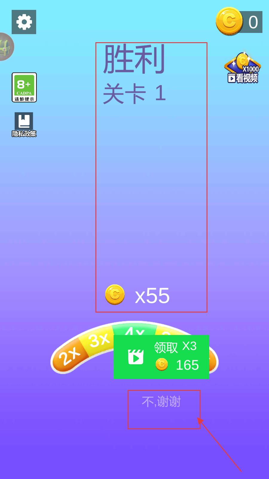 4、在成功通關(guān)關(guān)卡1后,可領(lǐng)取55金幣獎(jiǎng)勵(lì),也可領(lǐng)取3倍,或是直接點(diǎn)擊下方按鈕直接領(lǐng)取。