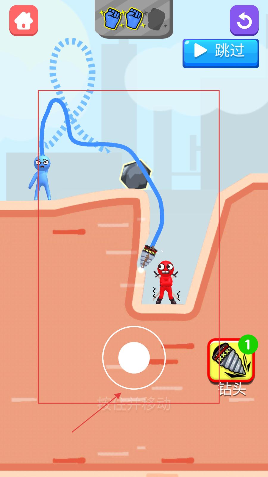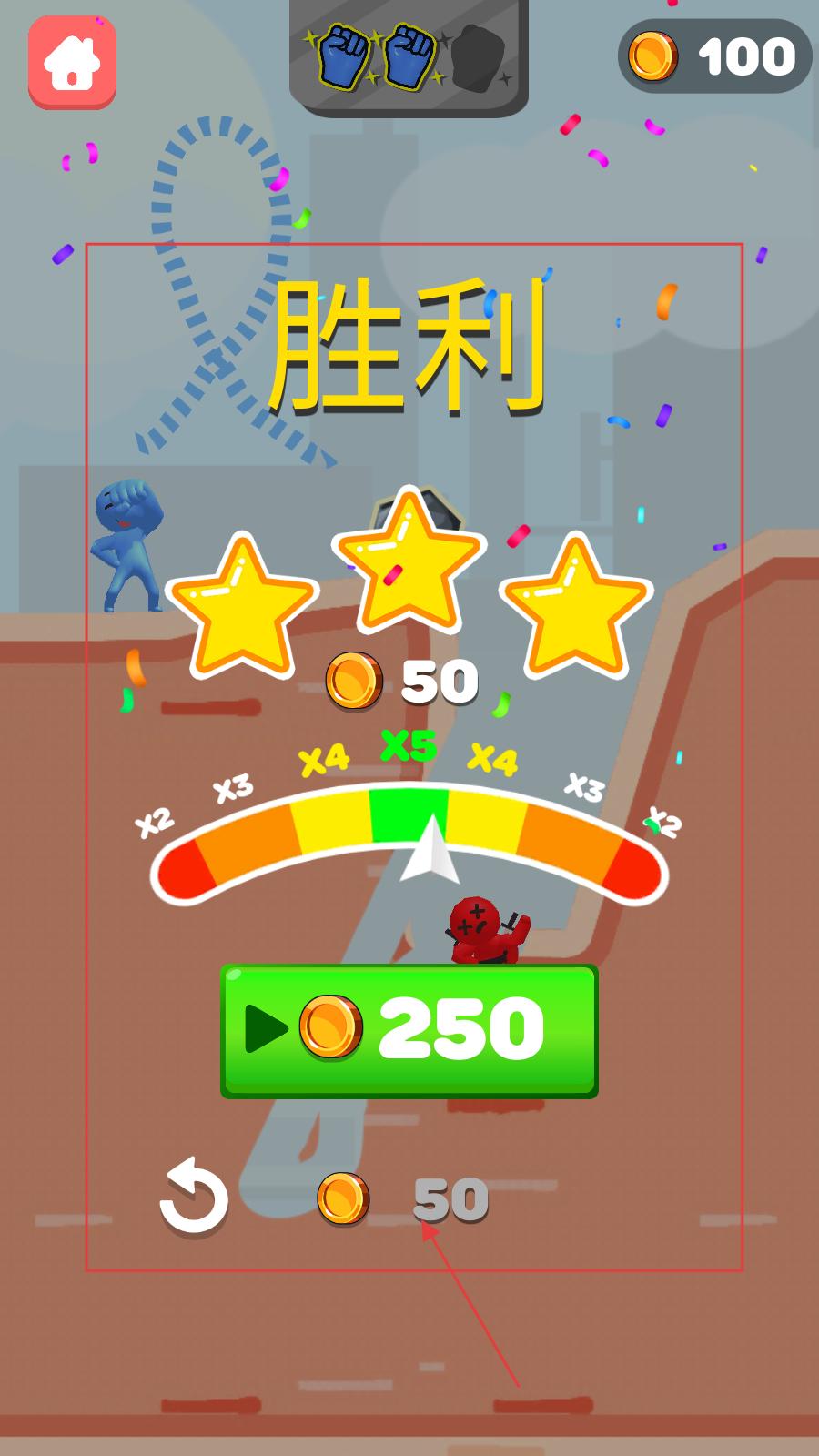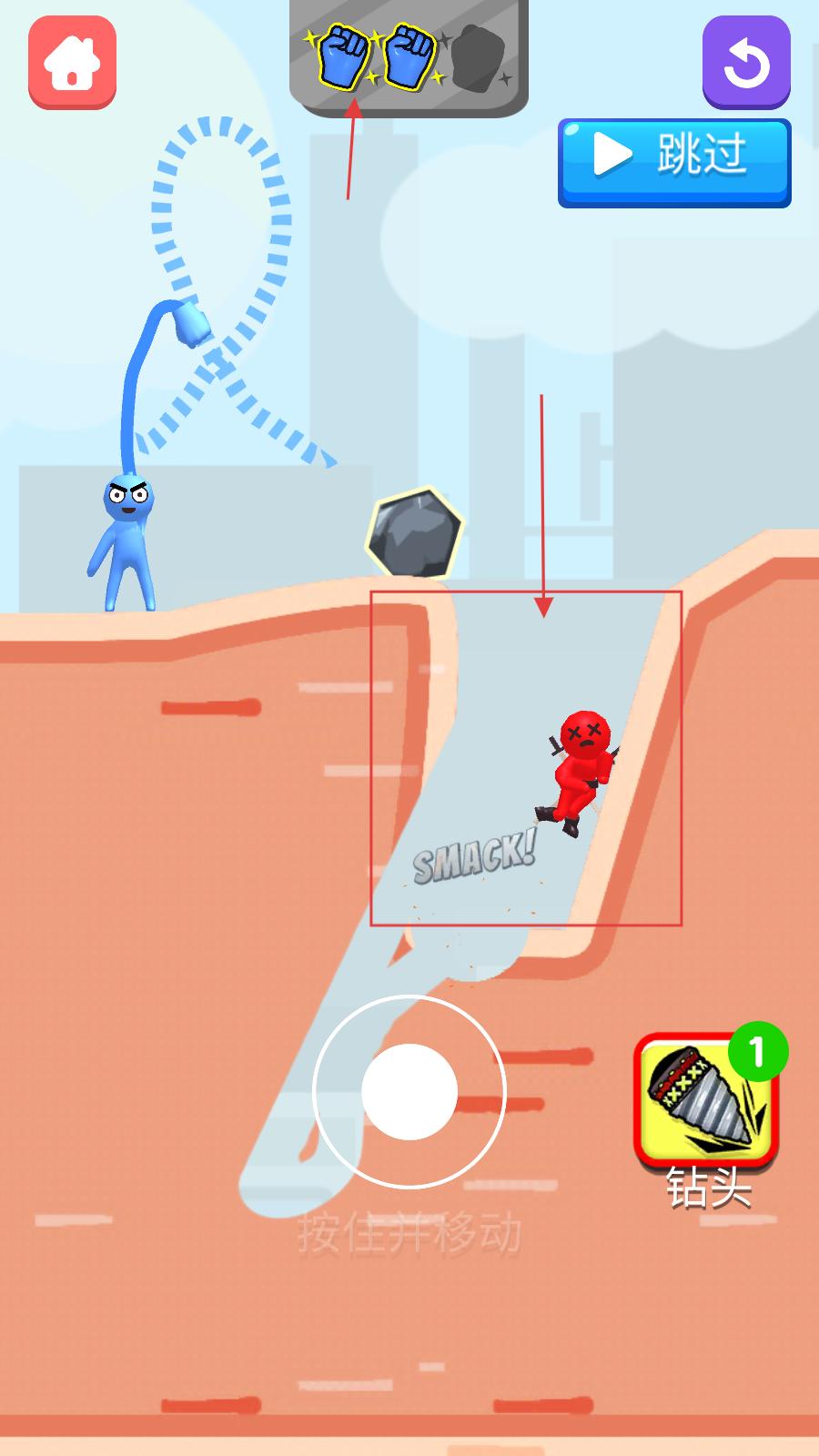 1、玩家需要操控藍(lán)色角色的拳頭,利用道具等瞄準(zhǔn)紅色敵人進(jìn)行攻擊,同時注意躲避敵人反擊。
