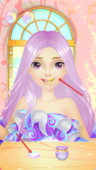 2、進行唇部護理,使用相關(guān)物品,對公主的嘴唇進行清潔等操作,為后續(xù)美妝步驟做準(zhǔn)備。
