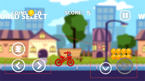 3、利用屏幕上的左右箭頭按鈕控制車輛的左右移動(dòng),下方的箭頭等按鈕控制車輛的前進(jìn)、后退等在賽道上行駛的同時(shí),盡量收集賽道上的金幣。