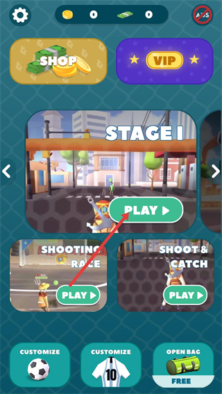 1、界面有商店、會(huì)員等選項(xiàng),還有不同游戲模式,選擇STAGE1下的PLAY,開(kāi)啟足球射門(mén)關(guān)卡。