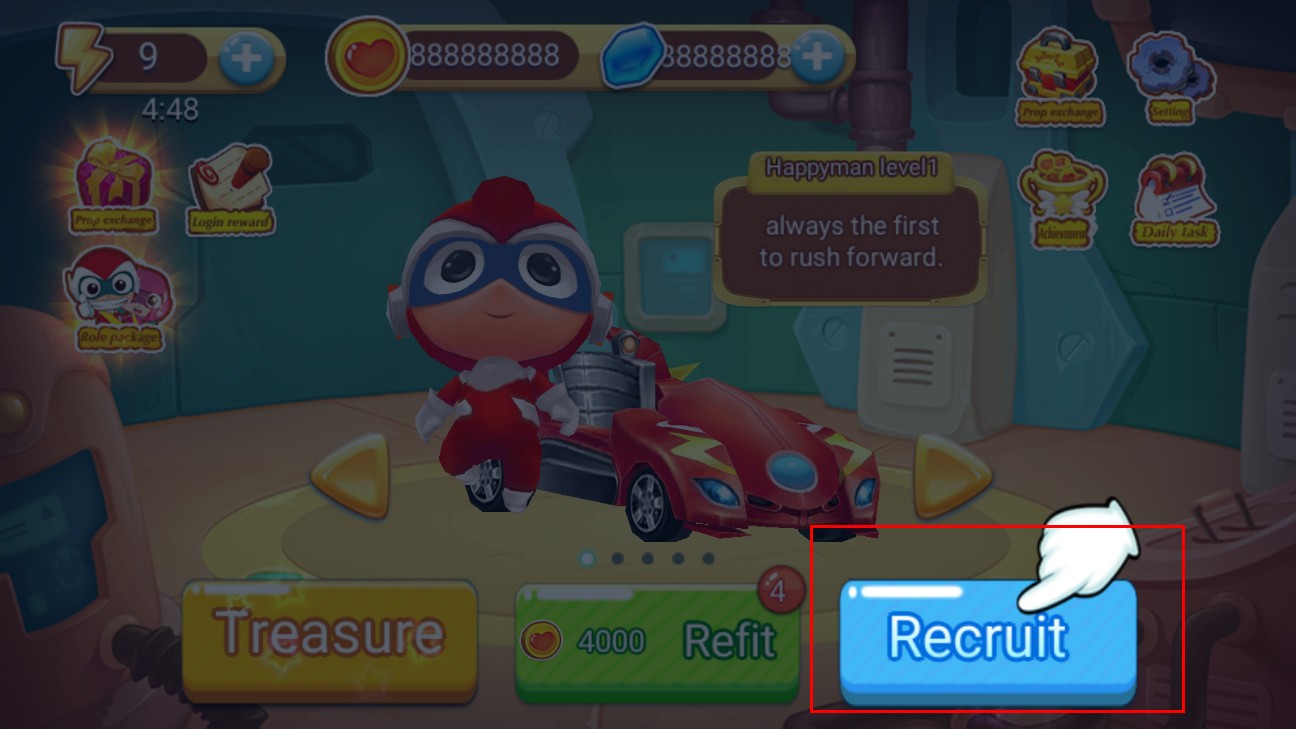 1、進入游戲主界面,能看到角色和賽車形象,點擊右下角Recruit按鈕,可進行角色招募相關操作,獲取新角色助力賽車冒險。
