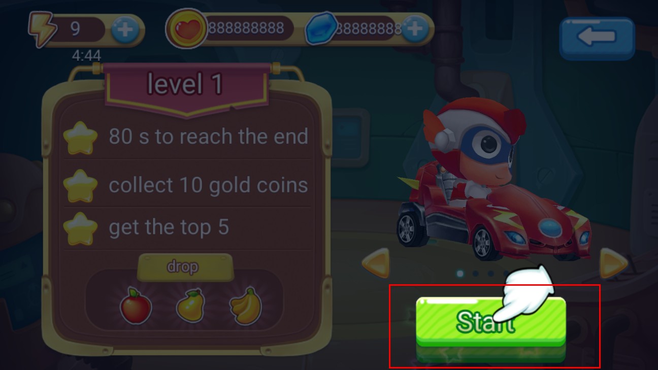 2、在關卡選擇界面,看到level1的任務要求,點擊綠色Start按鈕,即可開啟第一關的賽車挑戰(zhàn),朝著目標進發(fā)。