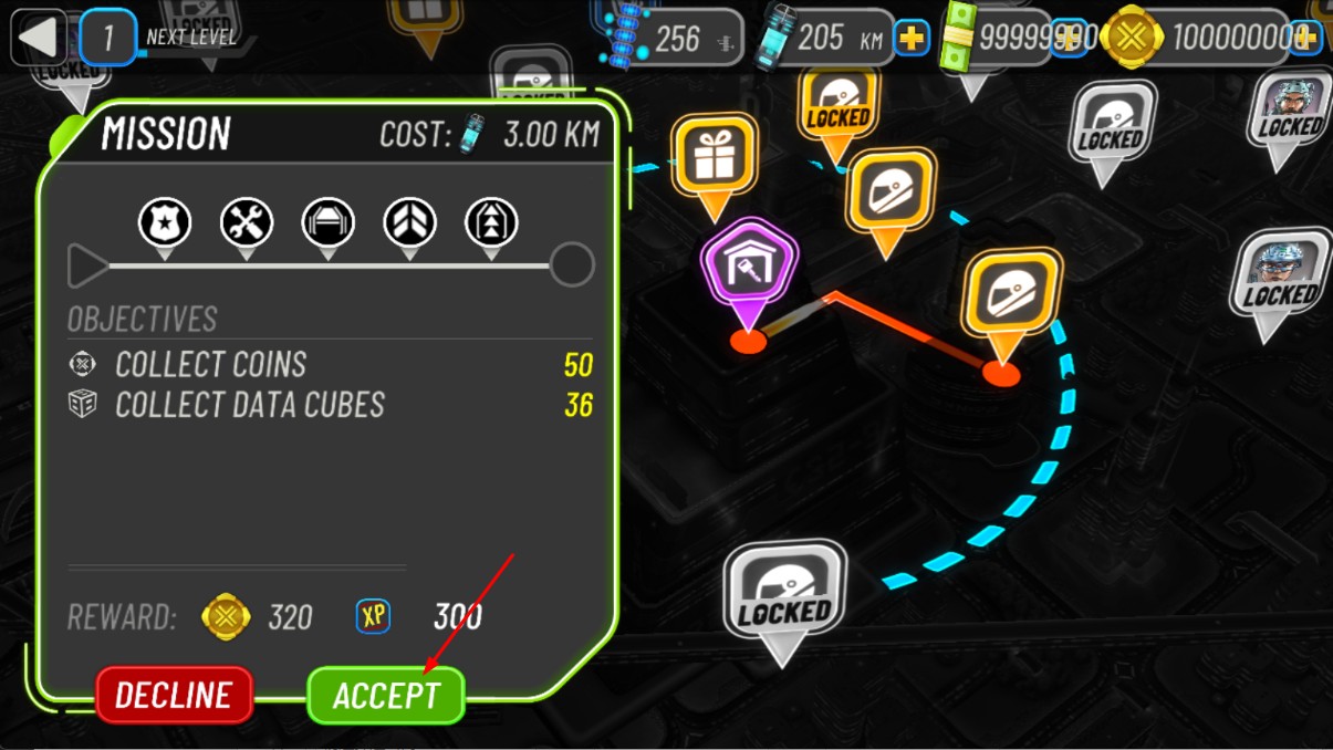 2、在任務(wù)界面,能看到收集金幣、數(shù)據(jù)立方體等目標(biāo),點(diǎn)擊綠色ACCEPT按鈕,接受任務(wù)后進(jìn)入賽道開始競(jìng)速。
