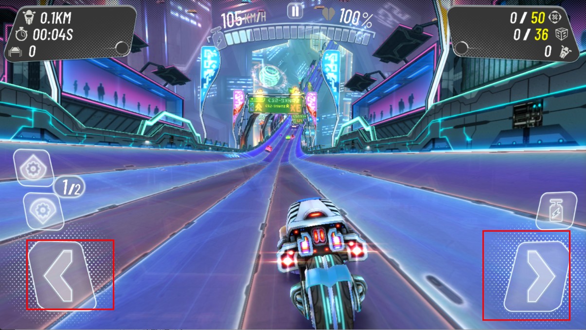 3、駕駛摩托時(shí),通過(guò)點(diǎn)擊左側(cè)或右側(cè)方向按鈕,可控制摩托左右移動(dòng),躲避障礙,調(diào)整行駛路線,保持高速前進(jìn)。