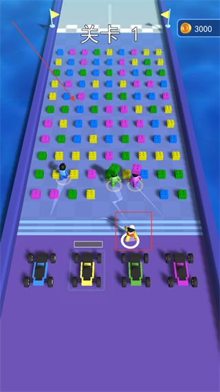 1、在關(guān)卡開始界面觀察賽道上分布的彩色方塊和其他角色,點擊選擇自己操控的賽車及角色,隨后賽車自動出發(fā)進入賽道挑戰(zhàn)。