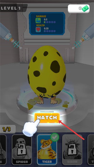 1、點(diǎn)擊HATCH按鈕孵化怪獸蛋,能孵化出如老虎等不同怪獸,開(kāi)啟后續(xù)的城市破壞等玩法。