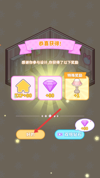 4、裝飾完成后會(huì)顯示恭喜獲得界面,給出經(jīng)驗(yàn)、鉆石和特殊獎(jiǎng)勵(lì),點(diǎn)擊好的確認(rèn)獎(jiǎng)勵(lì)。