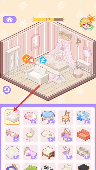 2、進(jìn)入房間界面,下方有各類(lèi)家具裝飾選項(xiàng),挑選合適的沙發(fā)等家具,放置到房間合適位置。