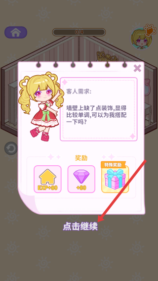 1、游戲開(kāi)始,會(huì)彈出客人需求提示,說(shuō)明墻壁缺裝飾需搭配,點(diǎn)擊繼續(xù),開(kāi)啟裝飾任務(wù)。