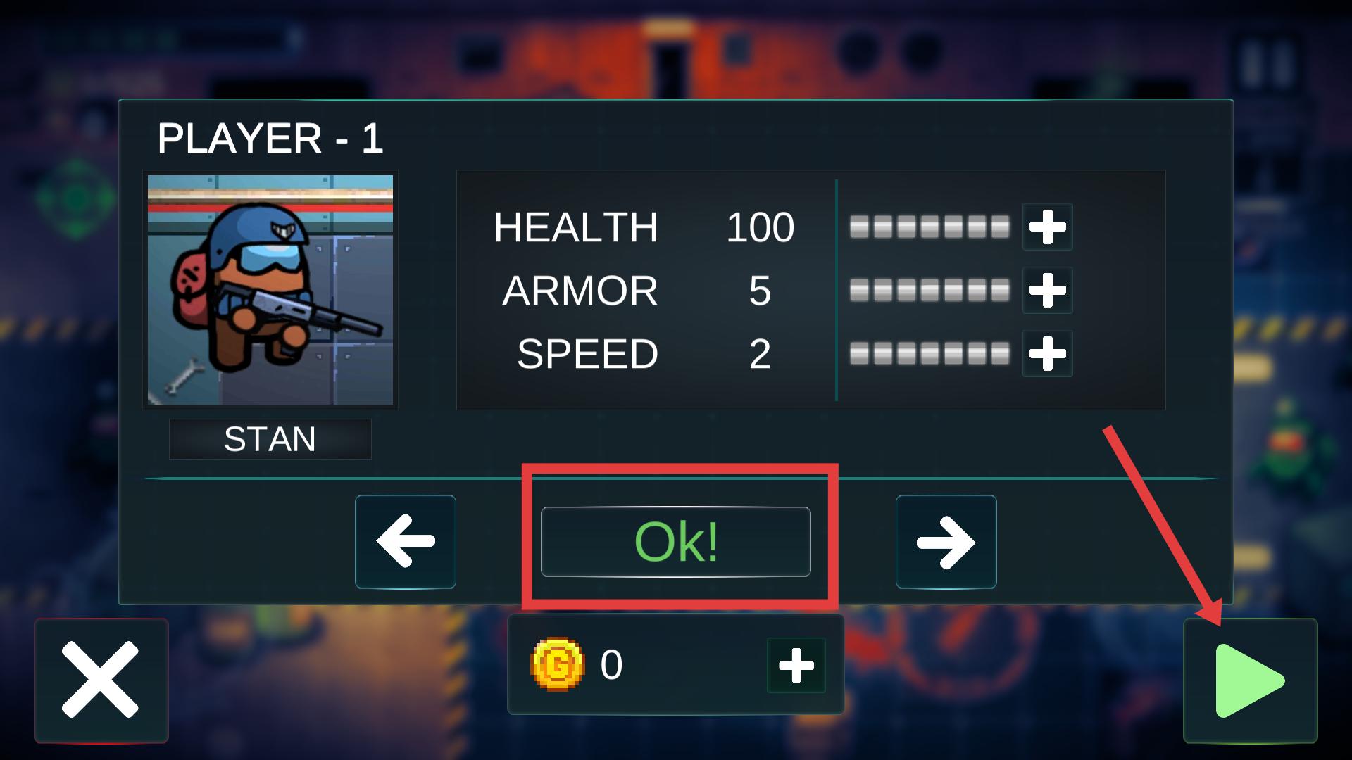2、在單人游戲準備界面查看角色的生命值、護甲、速度等屬性,確認無誤后,點擊Ok按鈕,再點擊右下角的綠色開始按鈕,進入游戲場景。