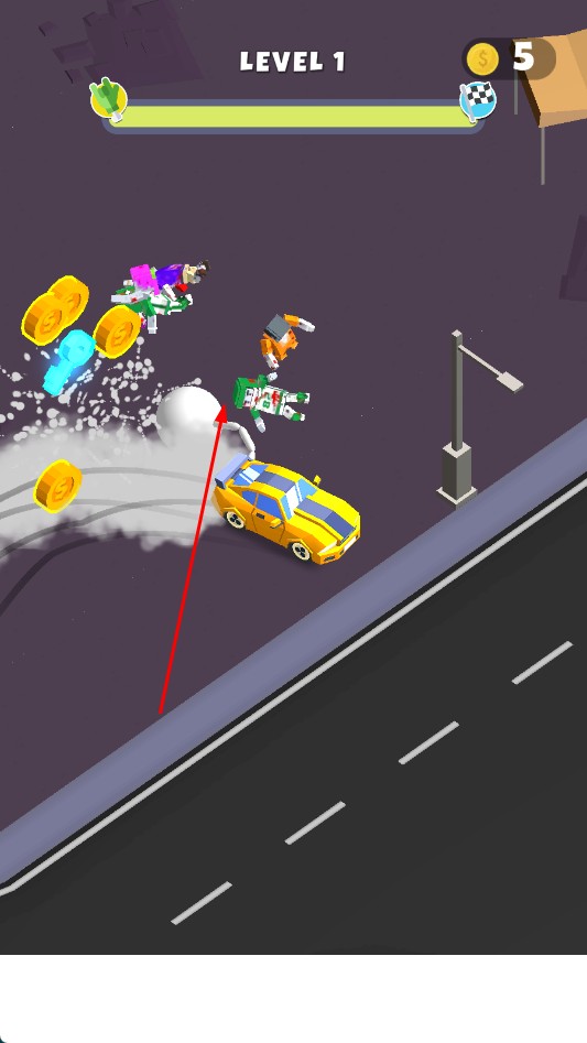2、啟動后點擊左右屏幕搖擺使汽車在道路上行駛,利用汽車后方的大擺錘撞擊路上的目標(biāo),撞擊成功可獲得金幣,積累分?jǐn)?shù)。