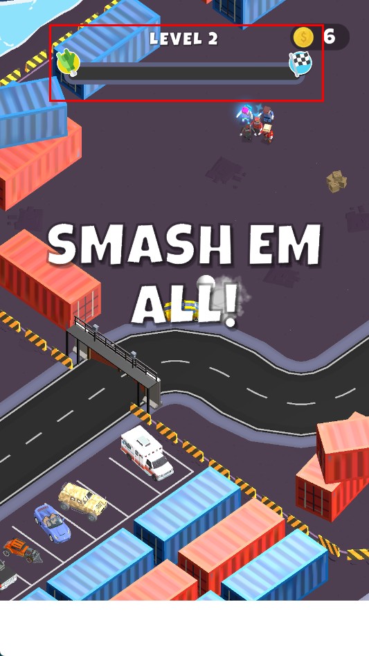 3、在關(guān)卡內(nèi)能看到關(guān)卡進(jìn)度信息,每擊殺一個敵人即可增加進(jìn)度條,為下一關(guān)的撞擊挑戰(zhàn)做好準(zhǔn)備。
