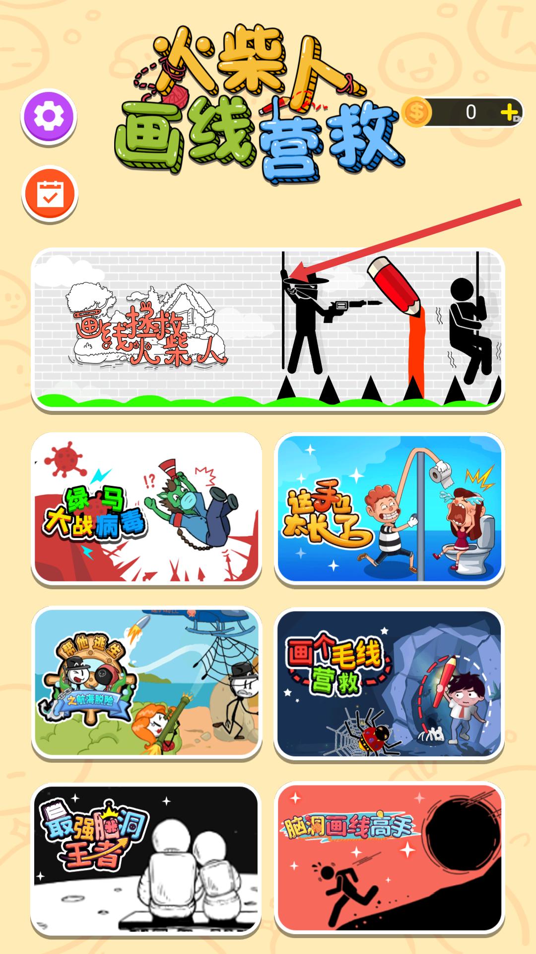 1、進(jìn)入游戲界面,有多種玩法選項(xiàng),選擇畫線拯救火柴人相關(guān)玩法,開啟趣味畫線營救挑戰(zhàn),體驗(yàn)獨(dú)特游戲樂趣。