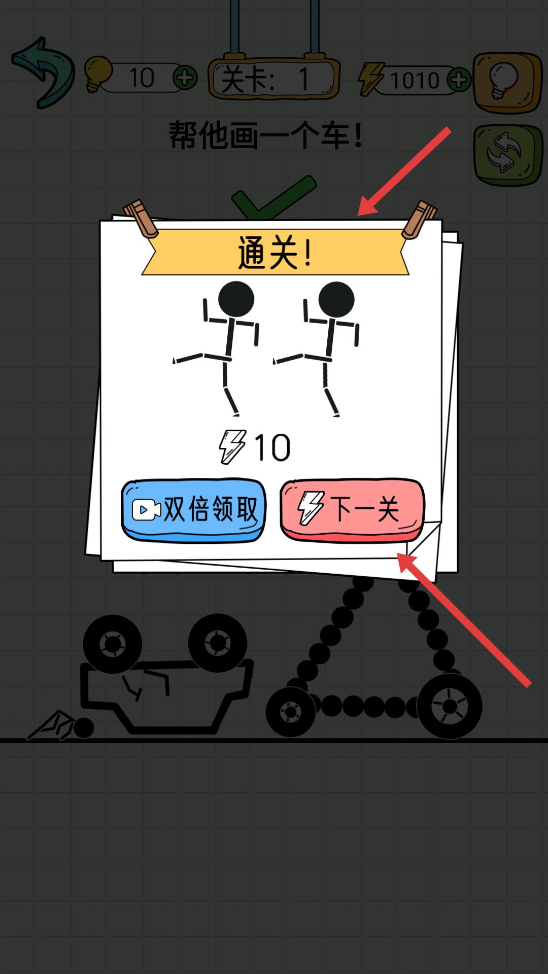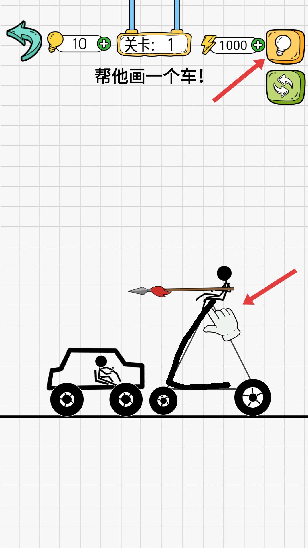 3、進(jìn)入關(guān)卡后,會有任務(wù)提示,比如幫火柴人畫一輛車,按照提示在合適區(qū)域畫線,助力火柴人完成任務(wù)。