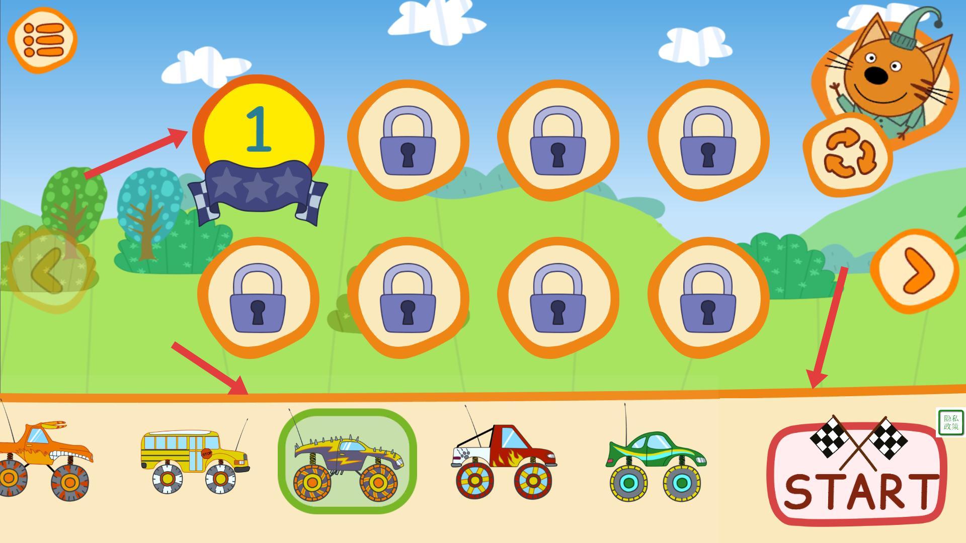 1、進入游戲,看到小貓咪們和賽車,點擊開始按鈕,開啟有趣的賽車挑戰(zhàn),感受歡樂的賽車氛圍。