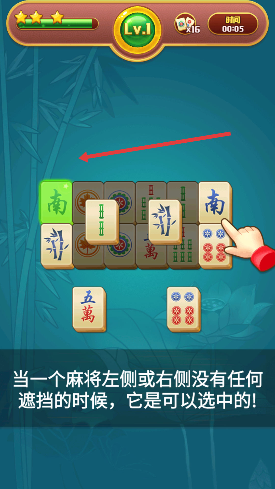 2、進入關(guān)卡后觀察界面上的麻將分布,尋找左右兩側(cè)沒有遮擋的麻將,這些麻將可以被選中進行消除操作。
