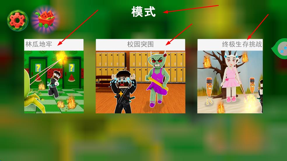 1、進(jìn)入游戲可以選擇模式,若想體驗(yàn)地牢冒險(xiǎn)選林瓜地牢,校園場(chǎng)景選校園突圍,高難度生存選終極生存挑戰(zhàn)。