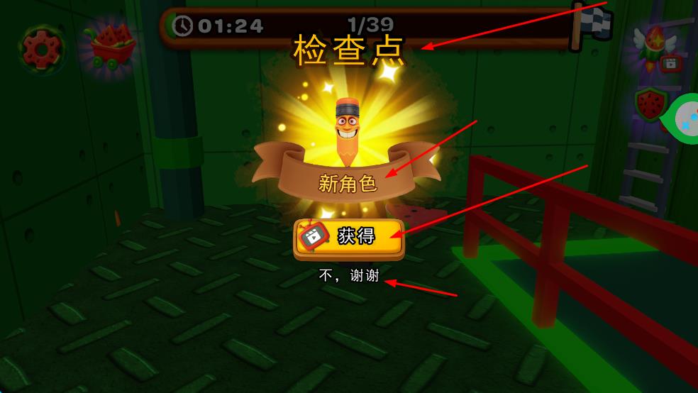 4、操縱人物到達(dá)檢查點(diǎn)后,若想解鎖新角色點(diǎn)擊獲得,不想則選不,謝謝,繼續(xù)后續(xù)游戲流程。