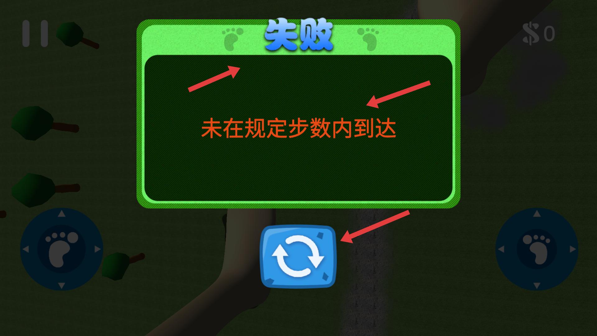 4、若未在規(guī)定步數(shù)內(nèi)到達目標(biāo)位置,會出現(xiàn)失敗提示界面,此時可點擊重新開始按鈕,再次挑戰(zhàn)關(guān)卡。