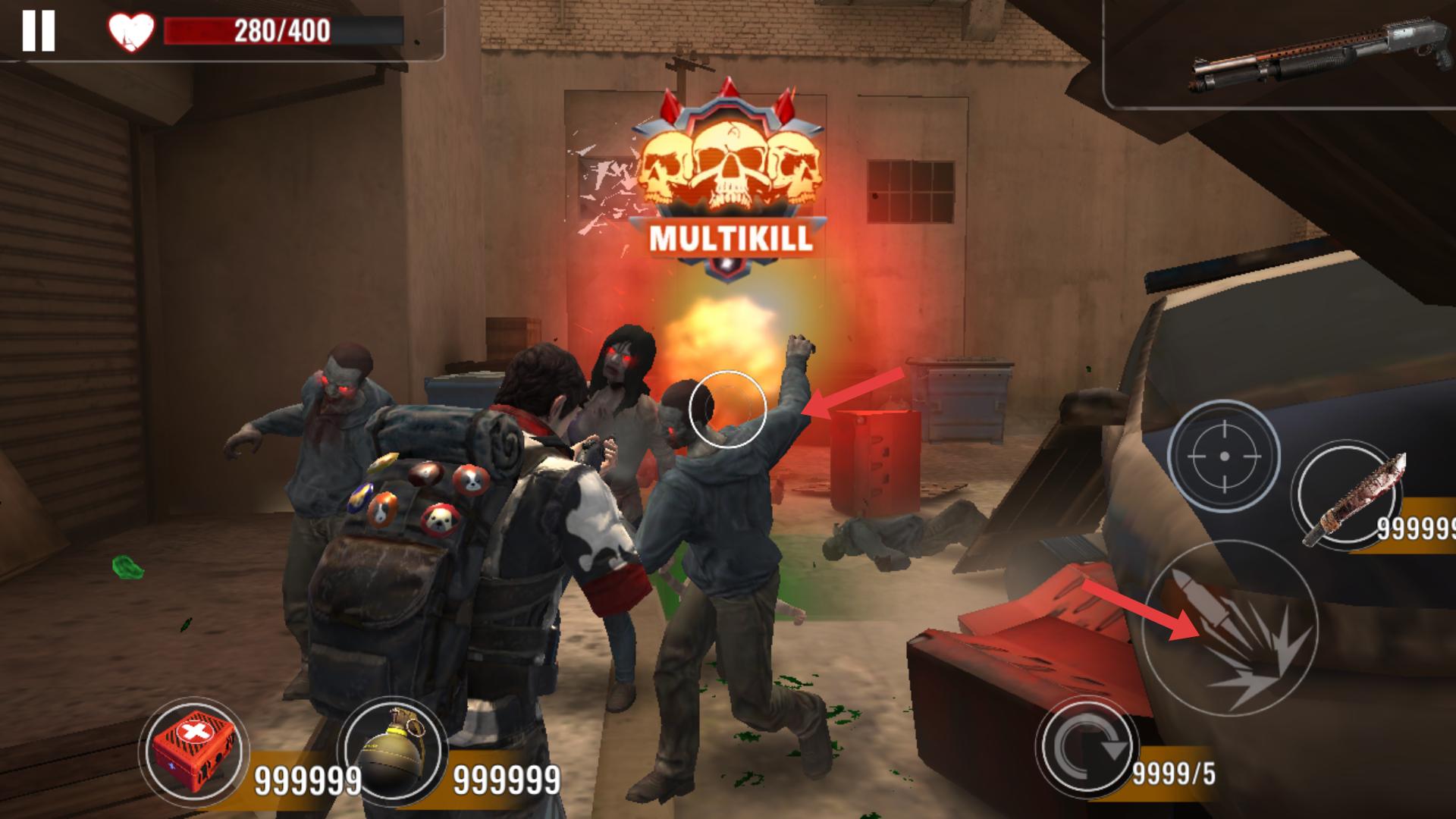 2、戰(zhàn)斗中,瞄準僵尸點擊射擊,遇到多個僵尸聚集時,可點擊右側火箭彈圖標釋放范圍攻擊,快速清剿敵人。