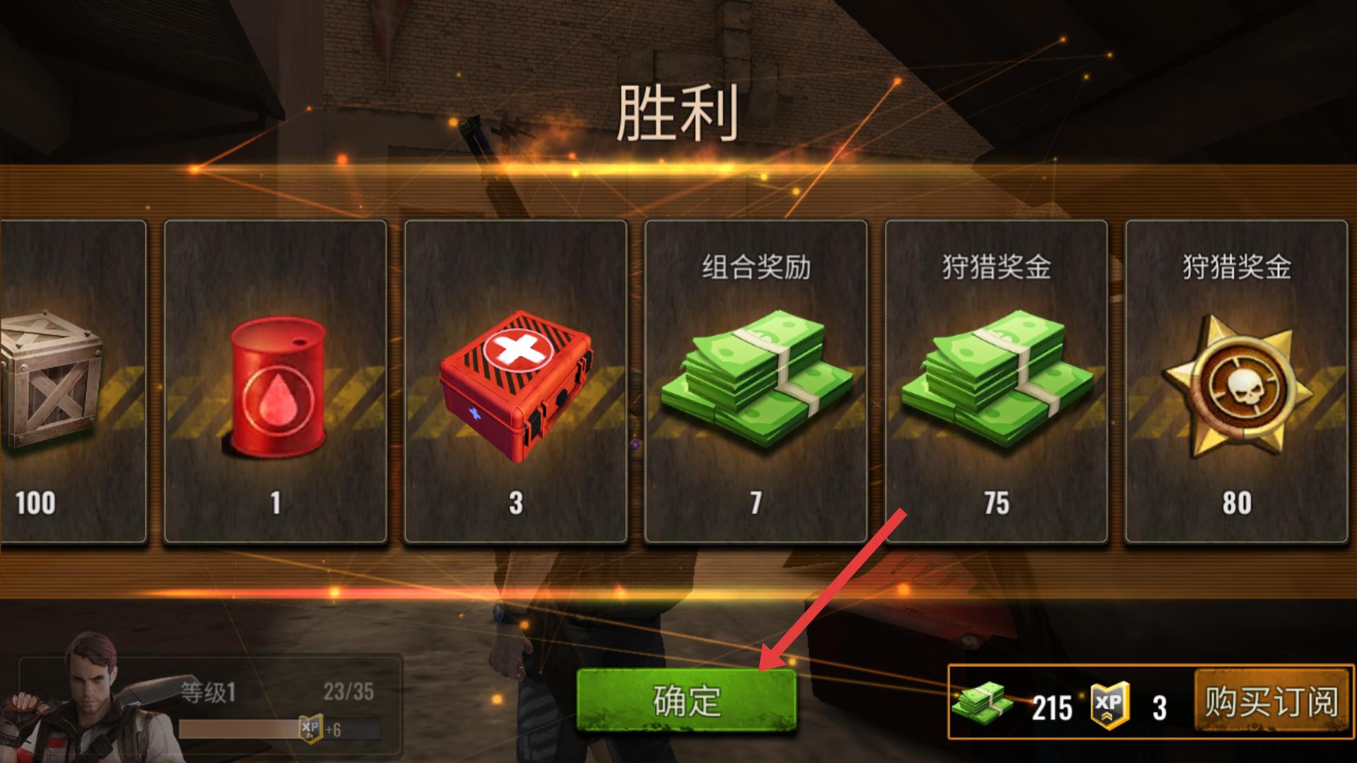 3、成功擊敗所有僵尸后,會顯示勝利界面,此時點擊綠色確定按鈕,就能領取戰(zhàn)斗獲得的物資、金錢等獎勵。