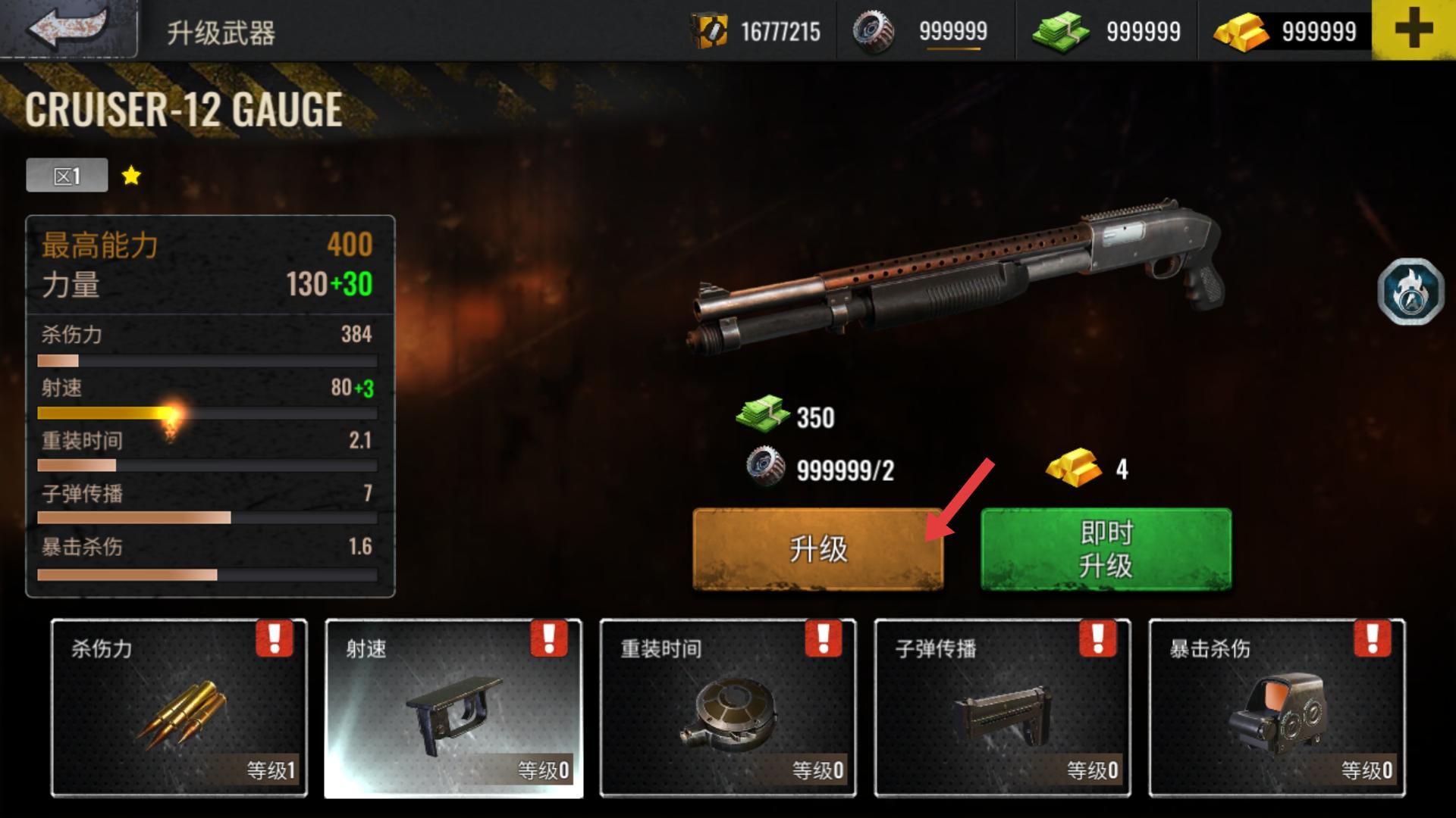 2、進(jìn)入武器升級(jí)頁(yè)面后,點(diǎn)擊升級(jí)按鈕,消耗相應(yīng)金錢和材料,能提升武器的殺傷力、射速等屬性,增強(qiáng)作戰(zhàn)能力。