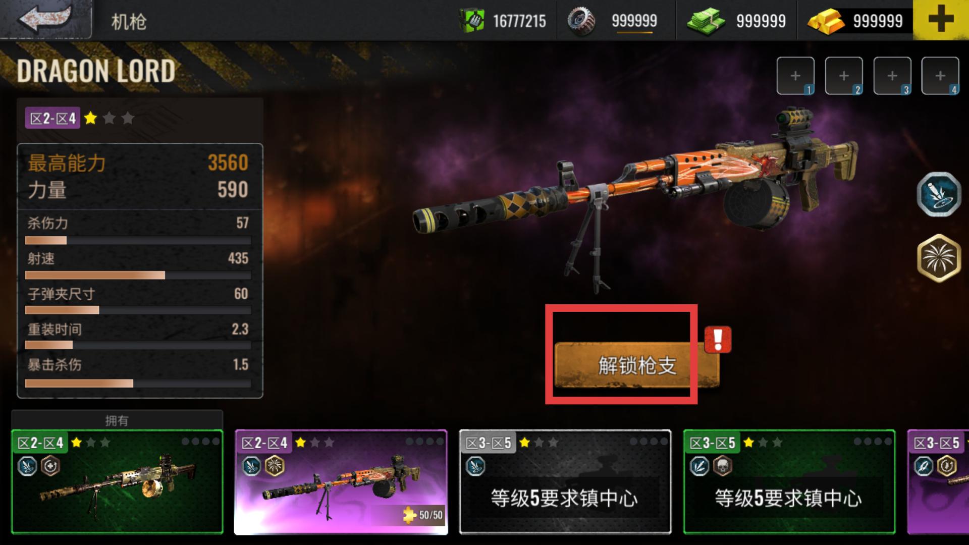 3、當(dāng)獲取新的機(jī)槍時(shí),在機(jī)槍界面點(diǎn)擊解鎖槍支按鈕,可解鎖該機(jī)槍,解鎖后可將其用于戰(zhàn)斗,豐富武器選擇。