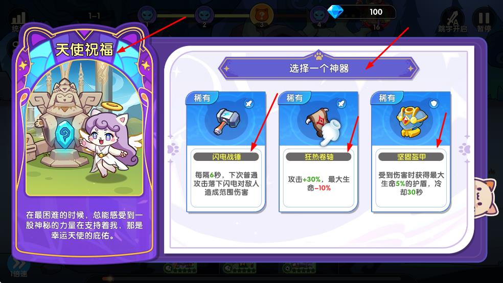 3、神器選擇結(jié)合需求,缺范圍傷害選閃電戰(zhàn)錘,追求高攻選狂熱卷軸,脆皮選堅固盔甲保生存。