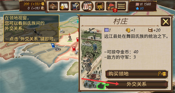 3、進入領(lǐng)地視窗后點擊右側(cè)外交關(guān)系按鈕,查看氏族間外交態(tài)勢洞察周邊勢力聯(lián)盟或敵對關(guān)系,為征戰(zhàn)策略提供情報支持。