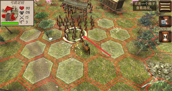 4、戰(zhàn)斗界面點擊己方部隊如弓箭足輕,查看六邊形格子的移動路徑,通過操作規(guī)劃行軍與攻擊指揮部隊在戰(zhàn)場克敵制勝。
