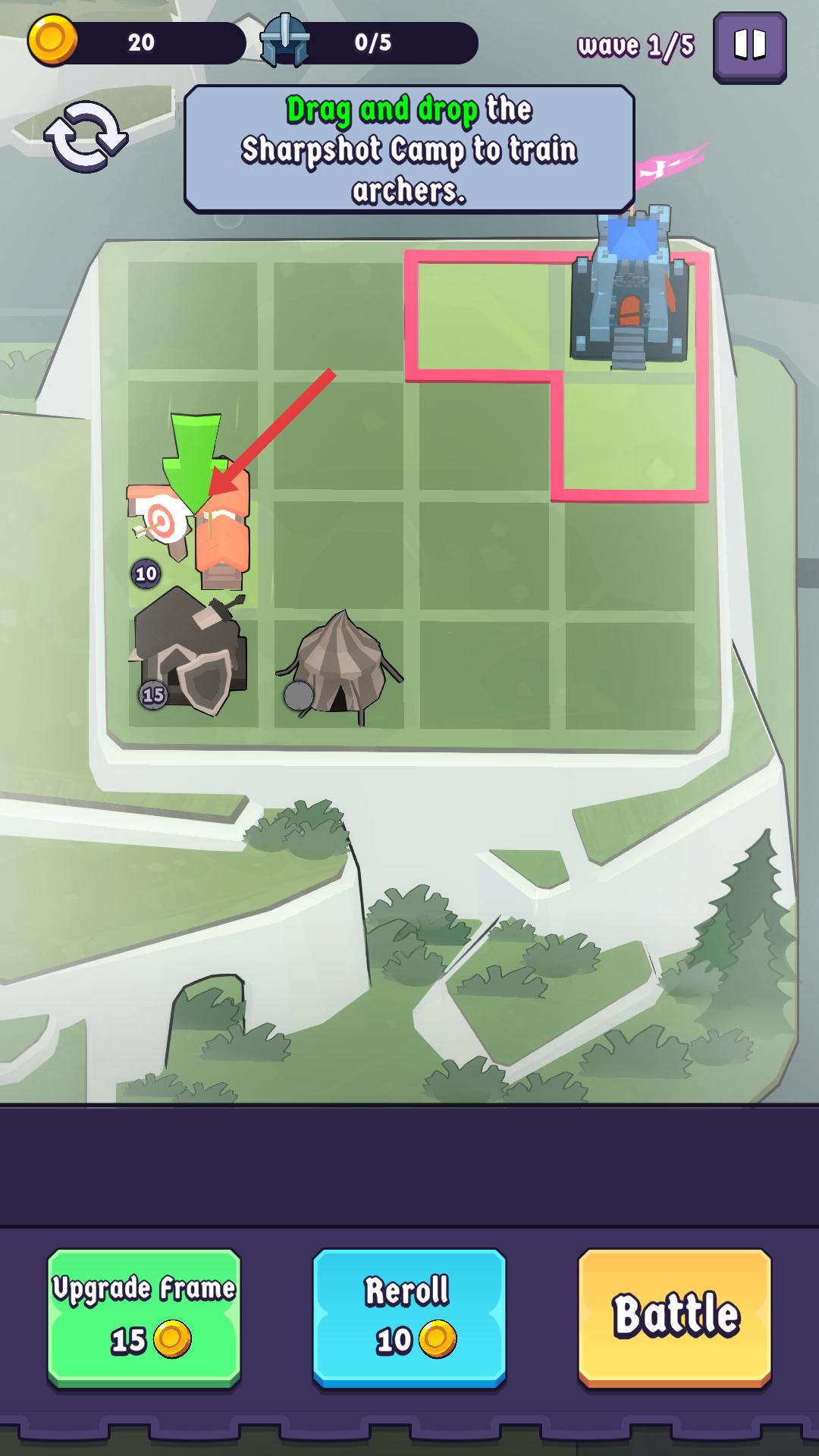 2、進(jìn)入關(guān)卡后,按照提示,拖拽Sharpshot Camp到合適位置,訓(xùn)練弓箭手,為抵御敵人進(jìn)攻組建遠(yuǎn)程防御力量。