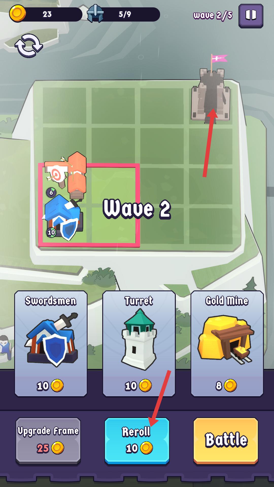 4、第一波敵人擊退后來到第二波,若對當(dāng)前可建造單位不滿意,可花費10金幣點擊Reroll刷新,獲取更合適的單位來強化防御。