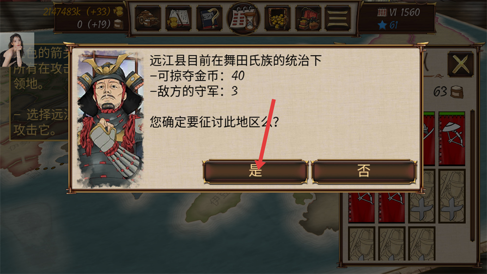 4、當(dāng)彈出是否征討目標(biāo)地區(qū)的提示框時(shí),點(diǎn)擊是,即可讓我方軍隊(duì)向該地區(qū)發(fā)起進(jìn)攻,展開戰(zhàn)斗。