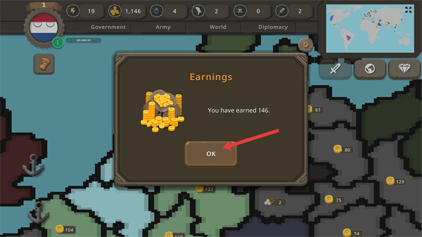 4、攻占領(lǐng)地后會彈出收益提示框,顯示獲得的金幣數(shù)量點擊OK按鈕關(guān)閉提示,繼續(xù)進(jìn)行后續(xù)游戲操作。